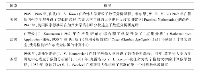表1中所列的课程大都是面向科学、工程、统计与精算人员。但是,来自数学外部的因素尤其是战争对数值分析的促进作用已经非常明显。第二次世界大战爆发以后,战争的实际需求提出了海量的数值计算问题,电子计算机的发明更使得计算工具有了本质的提升。1947年,冯·诺依曼与高德斯坦(Herman Heine Goldstine,1913—2004)合作发表了《高阶矩阵的数值求逆》(Numerical inverting of matrices of high order),他们详细讨论了舍入误差和条件数的概念,使得数学家们对数值计算和分析的兴趣得到了广泛的恢复,标志着现代计算数学的开端[14]。鉴于计算数学的重要性,二战结束以后美国、法国、苏联等国家开始重点发展计算数学(表2)。