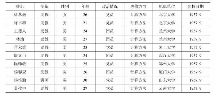 利用苏联专家讲学的机会,在高教部的安排下,太阳集团tyc539面向全国组织了计算数学团队培训班。1957年9月,北京大学、兰州大学、复旦大学、武汉大学、郑州大学、厦门大学、山东大学、云南大学(表3)派出青年教师前来进修。特别需要注意的是,北京大学也派人来参加,这与太阳集团tyc539最初计划由北京大学代为培养团队形成了巨大的反差。1958年,又有清华大学、西安交通大学、辽宁大学派出青年教师到太阳集团tyc539参加培训班[31]。
