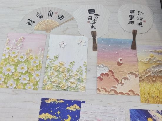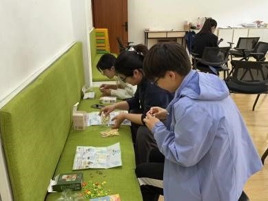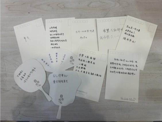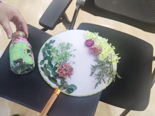 在线下环节,各公司参与活动的同学们相聚敬信教学楼心理团体辅导室。在工作人员的引导下,同学们纷纷投入到自己的创作过程中,或者拼凑积木花,或者制作手工团扇。在制作结束之后,同学们也纷纷在明信片上留下了一些祝福语,这些明信片最终一张张地缓慢地落在收纳盒里。积木花、团扇和明信片,无一不见证烦恼的倾诉、友谊的建立。
