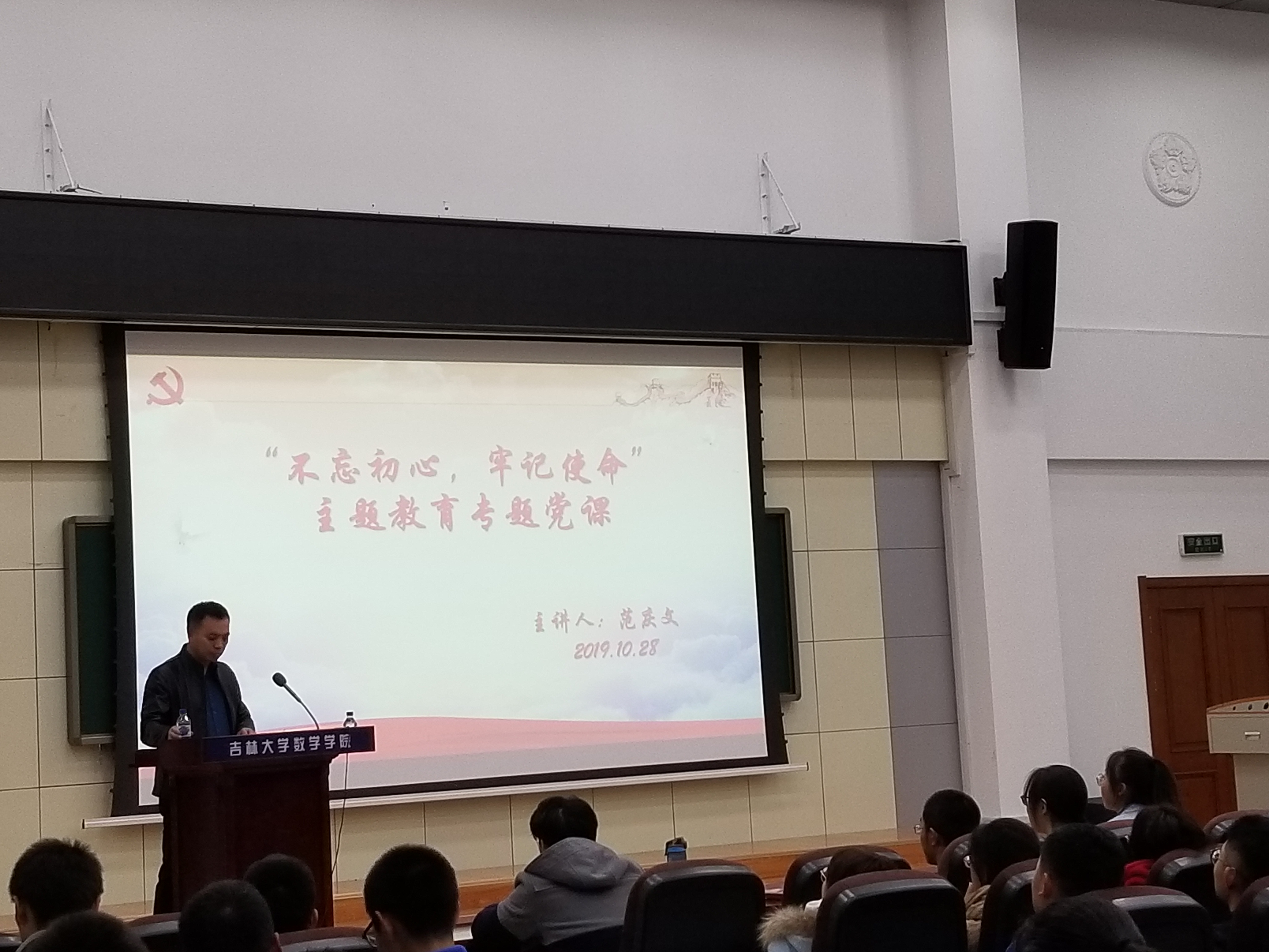 10月28日,数学公司党委副书记范庆文教授于数学楼报告厅为2019级新生上了大学的第一节党课。首先,范书记对2019级新同学表达了自己的欢迎,并鼓励同学们要做一个有责任,有担当的中国青年,挑起属于自己的担子,勇敢地迎难而上,为祖国建设披荆斩棘,努力实现中华民族谋复兴的历史使命。