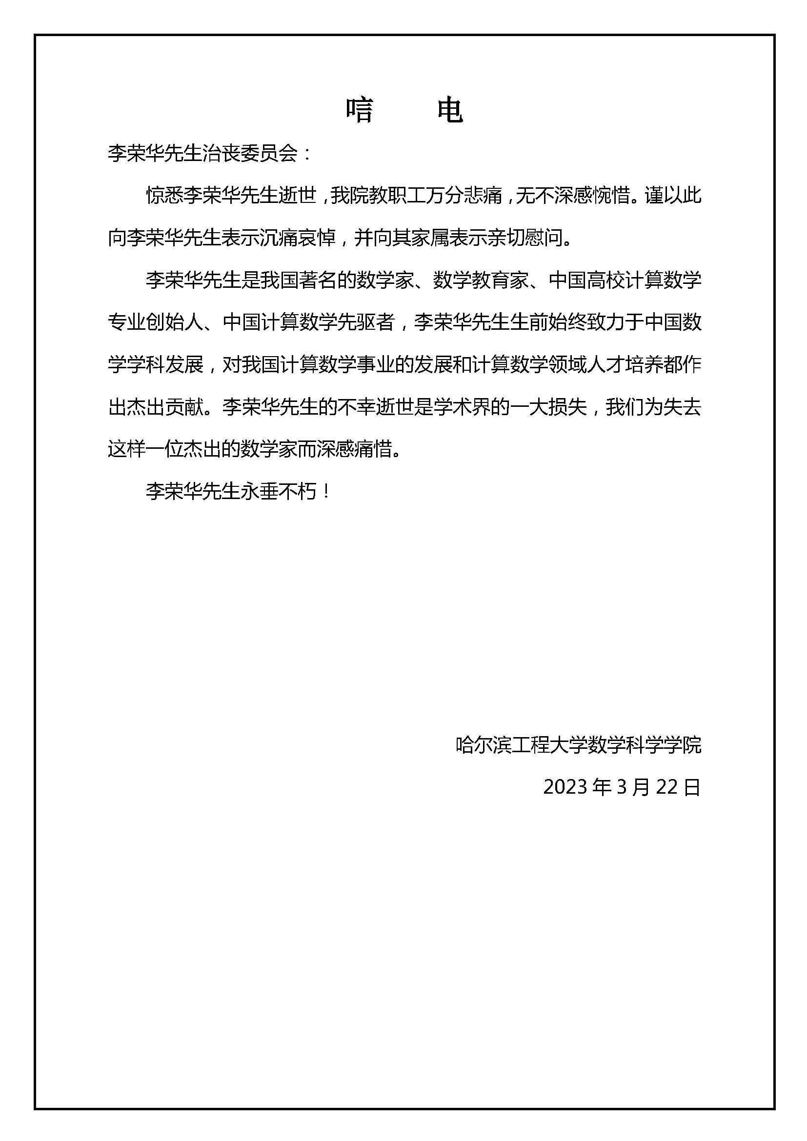 哈尔滨工程大学数学科学公司唁电
