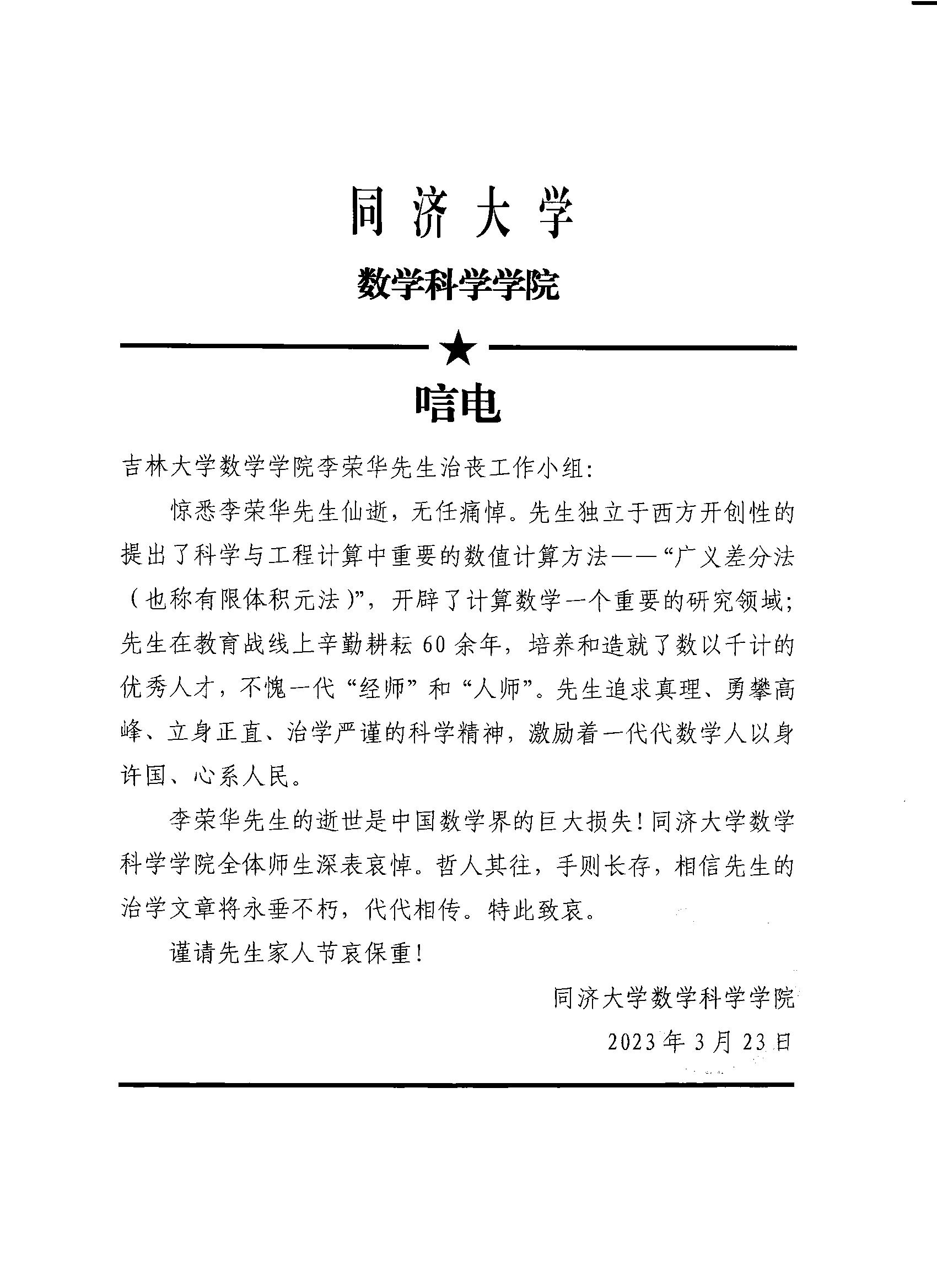 同济大学数学科学公司唁电