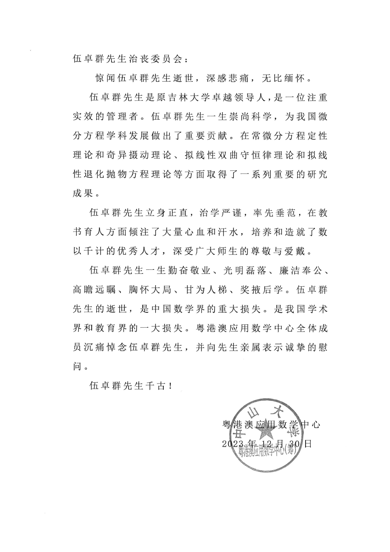 粤港澳应用数学中心唁电